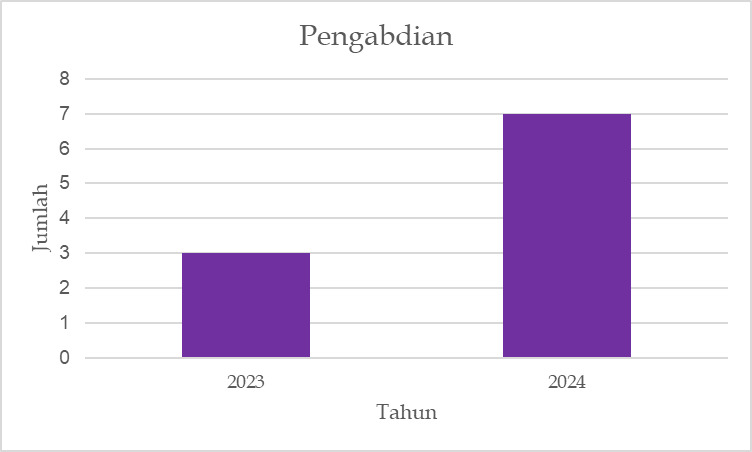 Berdasarkan Gambar diatas dapat dilihat bahwa jumlah luaran HKI pengabdian tahun 2023 berjumlah 3 dan tahun 2024 berjumlah 7. Telah terjadi peningkatan sebesar 57,14%